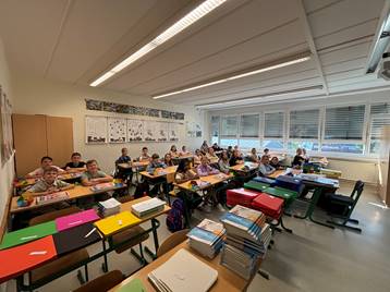 Viele Schüler kennen sich schon aus der Grundschule. Die Klassenlehrerinnen und neuen Schüler waren neugierig, was jeder von sich zu erzählen vermag. So lernte man sich kennen, bestaunte das Schulhaus, fing an, Bücher einzuschlagen und zum Schluss ging man gemeinsam zum Essen in den Kindergarten. Vielen Dank an den Förderverein unserer Schule, der dieses gemeinsame Mittagessen ermöglichte.